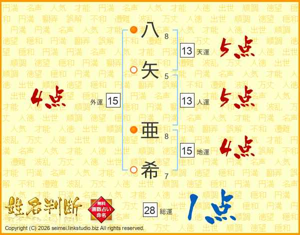 八矢亜希さんの外運は15画の4点!