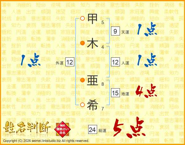 甲(5画)木(4画) 亜(8画)希(7画)
