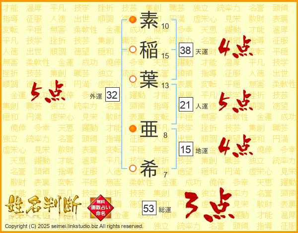素(10画)稲(15画)葉(13画) 亜(8画)希(7画)
