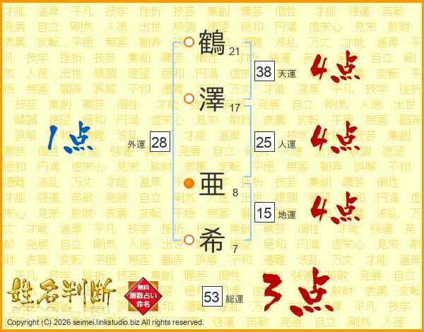 鶴(21画)澤(17画) 亜(8画)希(7画)