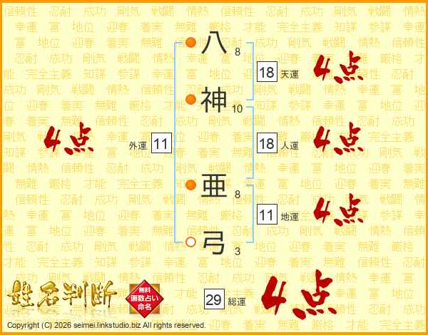 生活面を象徴する運勢です。外部から受ける影響力を表し、結婚運、家庭運や職場、環境への順応性を表します。総運から人運を引いた画数。姓や名が1文字の場合を除く。