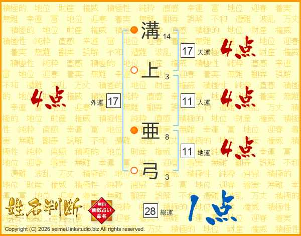 生活面を象徴する運勢です。外部から受ける影響力を表し、結婚運、家庭運や職場、環境への順応性を表します。総運から人運を引いた画数。姓や名が1文字の場合を除く。