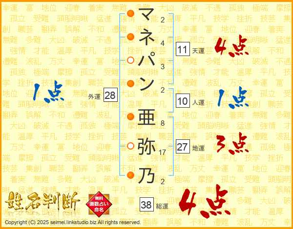 マ(2画)ネ(4画)パ(3画)ン(2画) 亜(8画)弥(17画)乃(2画)