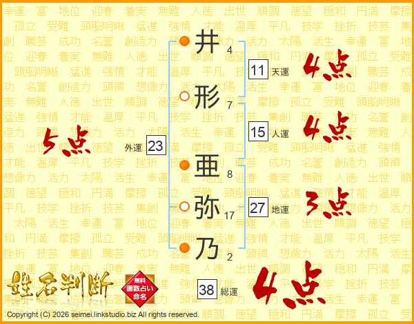 井(4画)形(7画) 亜(8画)弥(17画)乃(2画)