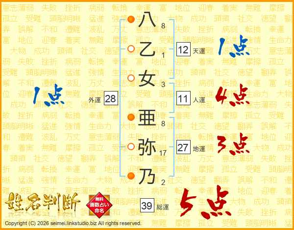 八(8画)乙(1画)女(3画) 亜(8画)弥(17画)乃(2画)