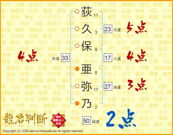 荻(11画)久(3画)保(9画) 亜(8画)弥(17画)乃(2画)