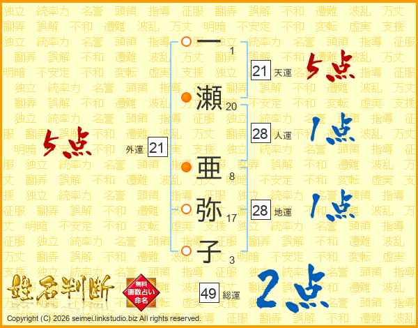 一(1画)瀬(20画) 亜(8画)弥(17画)子(3画)