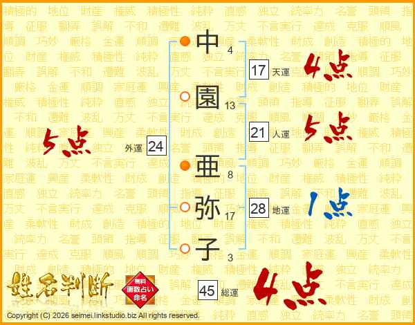 中園亜弥子さんの総運は45画の4点!