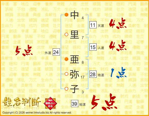 中(4画)里(7画) 亜(8画)弥(17画)子(3画)
