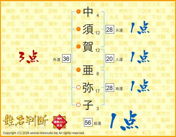 中(4画)須(12画)賀(12画) 亜(8画)弥(17画)子(3画)