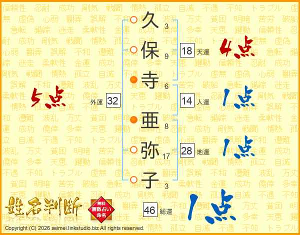 久(3画)保(9画)寺(6画) 亜(8画)弥(17画)子(3画)