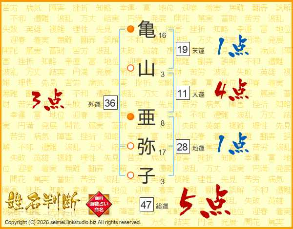 亀(16画)山(3画) 亜(8画)弥(17画)子(3画)