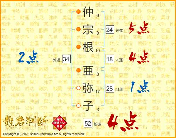 仲(6画)宗(8画)根(10画) 亜(8画)弥(17画)子(3画)