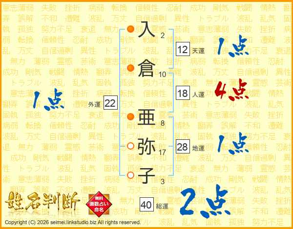 入倉亜弥子さんの総運は40画の2点!