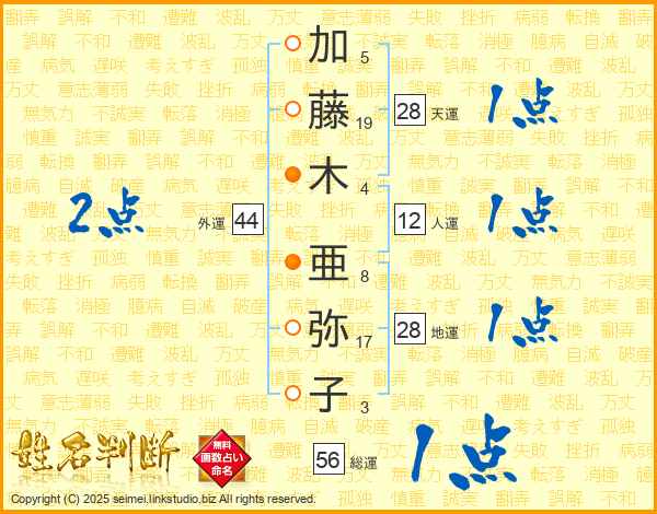 加(5画)藤(19画)木(4画) 亜(8画)弥(17画)子(3画)