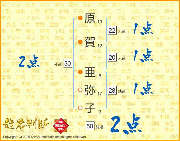原(10画)賀(12画) 亜(8画)弥(17画)子(3画)