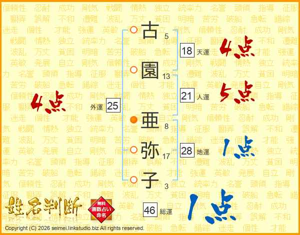 古(5画)園(13画) 亜(8画)弥(17画)子(3画)