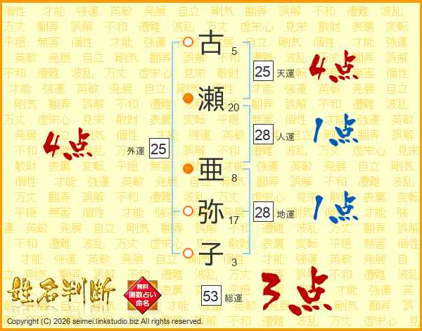 古(5画)瀬(20画) 亜(8画)弥(17画)子(3画)