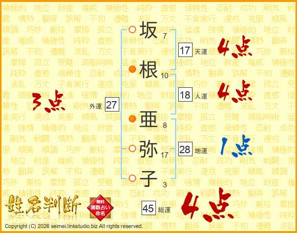 坂(7画)根(10画) 亜(8画)弥(17画)子(3画)