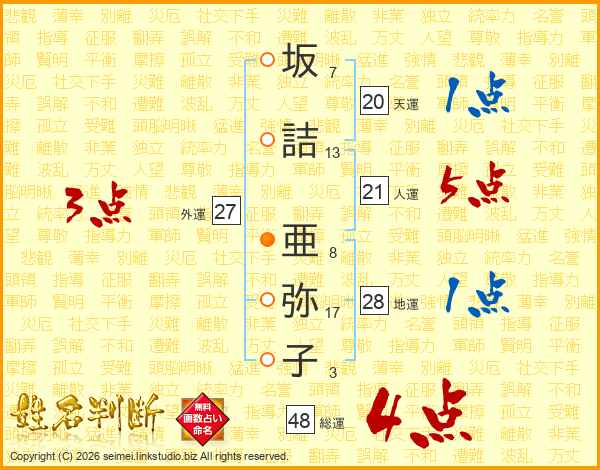 坂(7画)詰(13画) 亜(8画)弥(17画)子(3画)