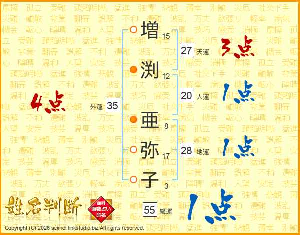 増(15画)渕(12画) 亜(8画)弥(17画)子(3画)