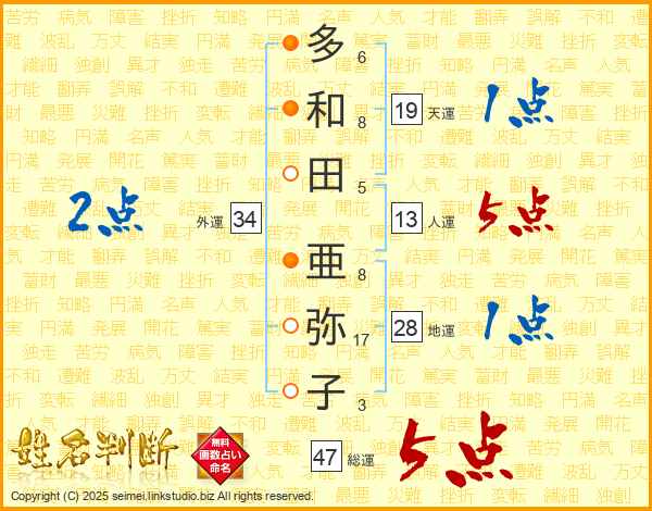 多(6画)和(8画)田(5画) 亜(8画)弥(17画)子(3画)