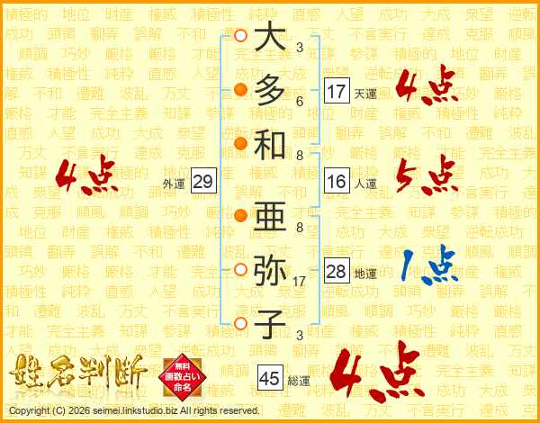 大(3画)多(6画)和(8画) 亜(8画)弥(17画)子(3画)