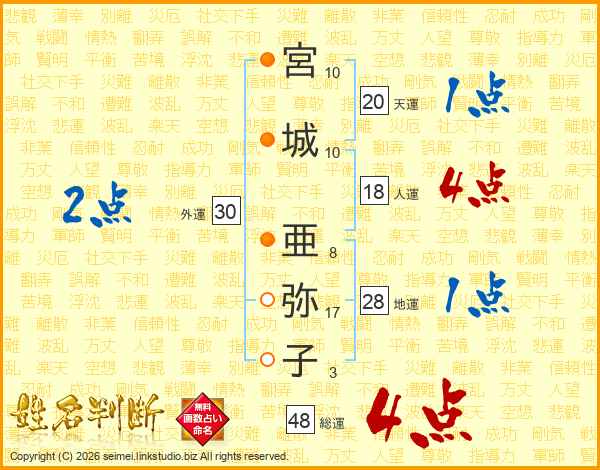 宮(10画)城(10画) 亜(8画)弥(17画)子(3画)