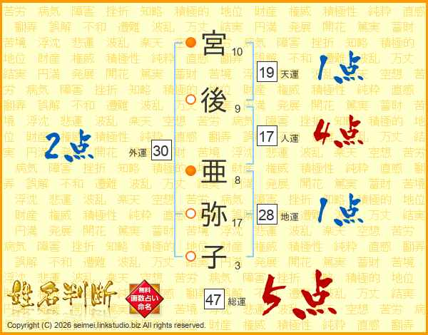 宮後亜弥子さんの総運は47画の5点!