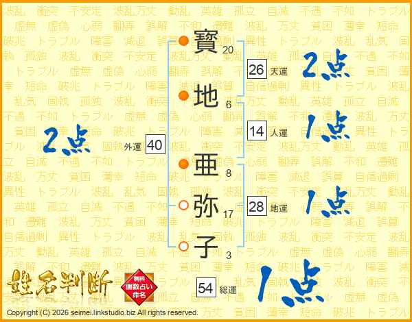 寳(20画)地(6画) 亜(8画)弥(17画)子(3画)