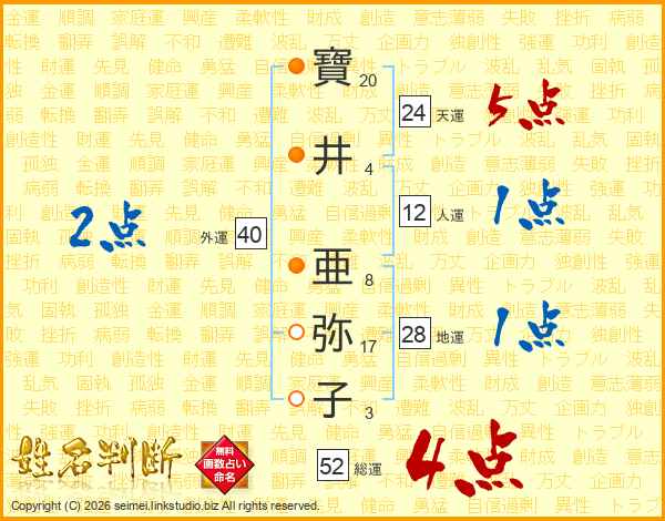 寶(20画)井(4画) 亜(8画)弥(17画)子(3画)