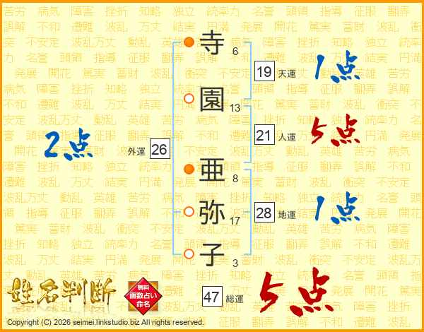 寺(6画)園(13画) 亜(8画)弥(17画)子(3画)