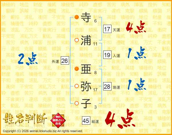寺(6画)浦(11画) 亜(8画)弥(17画)子(3画)