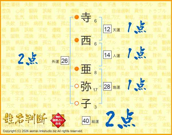 寺(6画)西(6画) 亜(8画)弥(17画)子(3画)