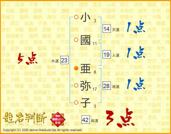 小(3画)國(11画) 亜(8画)弥(17画)子(3画)