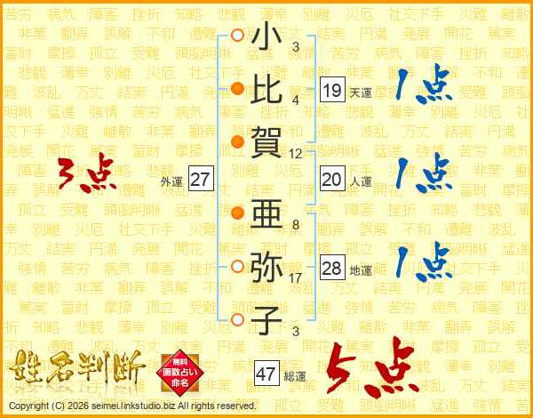 小比賀亜弥子さんの総運は47画の5点!