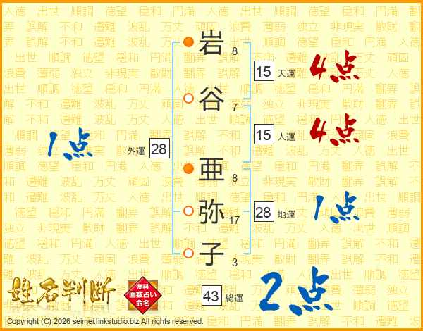 岩(8画)谷(7画) 亜(8画)弥(17画)子(3画)