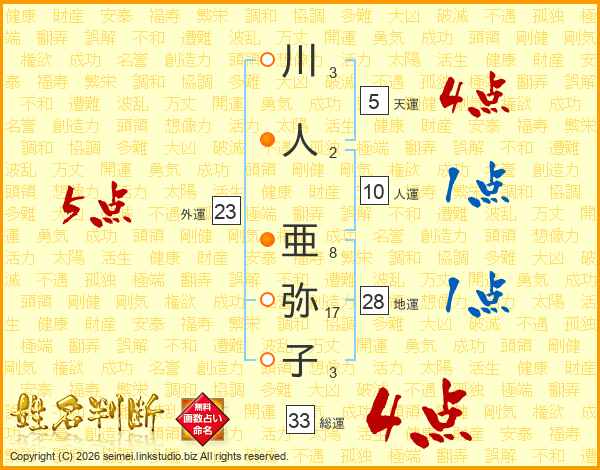 川(3画)人(2画) 亜(8画)弥(17画)子(3画)