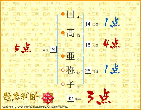 日(4画)髙(10画) 亜(8画)弥(17画)子(3画)