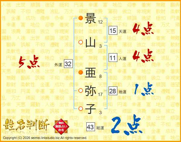 景(12画)山(3画) 亜(8画)弥(17画)子(3画)