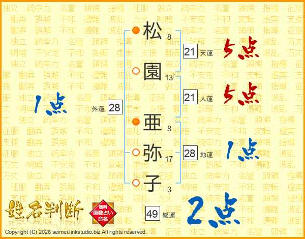 松(8画)園(13画) 亜(8画)弥(17画)子(3画)