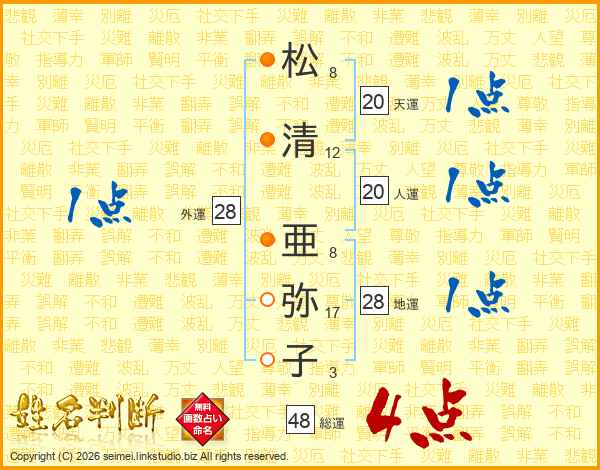 松(8画)清(12画) 亜(8画)弥(17画)子(3画)