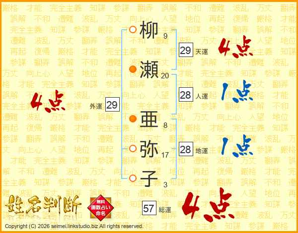 柳(9画)瀬(20画) 亜(8画)弥(17画)子(3画)