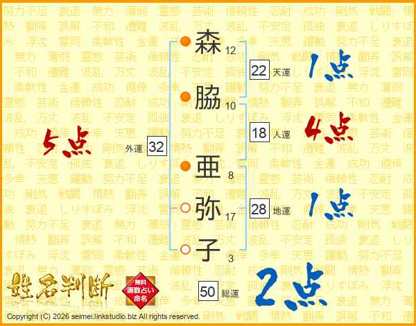 森(12画)脇(10画) 亜(8画)弥(17画)子(3画)