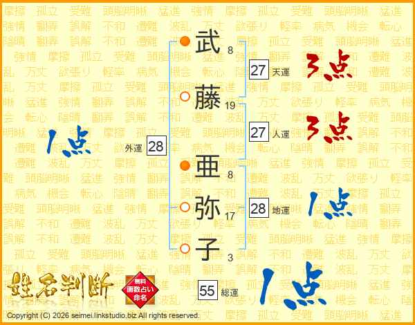 武(8画)藤(19画) 亜(8画)弥(17画)子(3画)