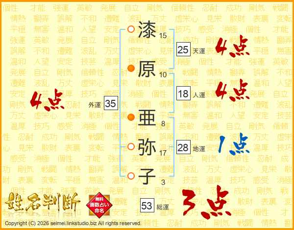 漆(15画)原(10画) 亜(8画)弥(17画)子(3画)