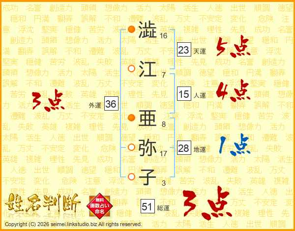 澁(16画)江(7画) 亜(8画)弥(17画)子(3画)