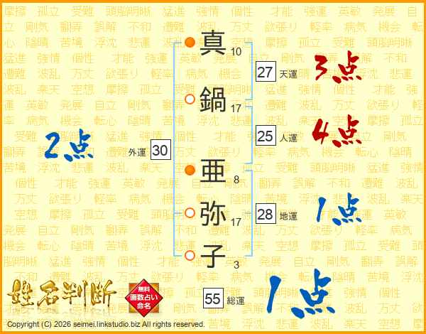 真(10画)鍋(17画) 亜(8画)弥(17画)子(3画)