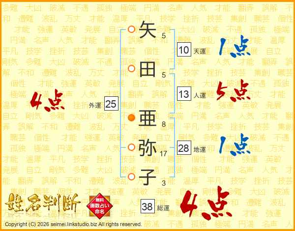 矢(5画)田(5画) 亜(8画)弥(17画)子(3画)