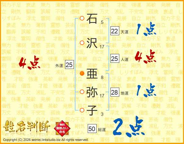 石(5画)沢(17画) 亜(8画)弥(17画)子(3画)